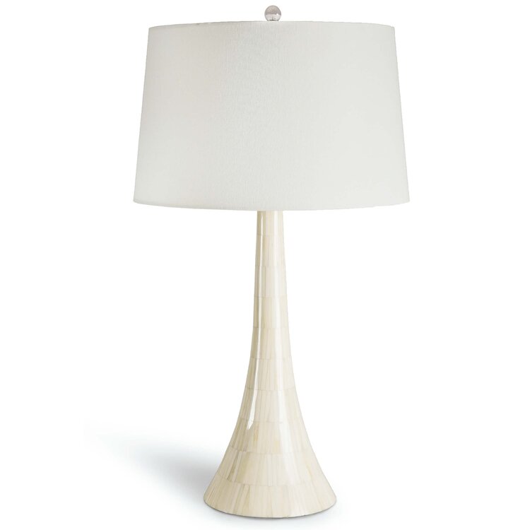 A mosaic pattern of carved ivory bone is hand applied by artisans to create the Tapered Mosiac table lamp. Polished brass hardware is paired with a natural linen shade, and topped with a round crystal finial for a clean sophisticated look.